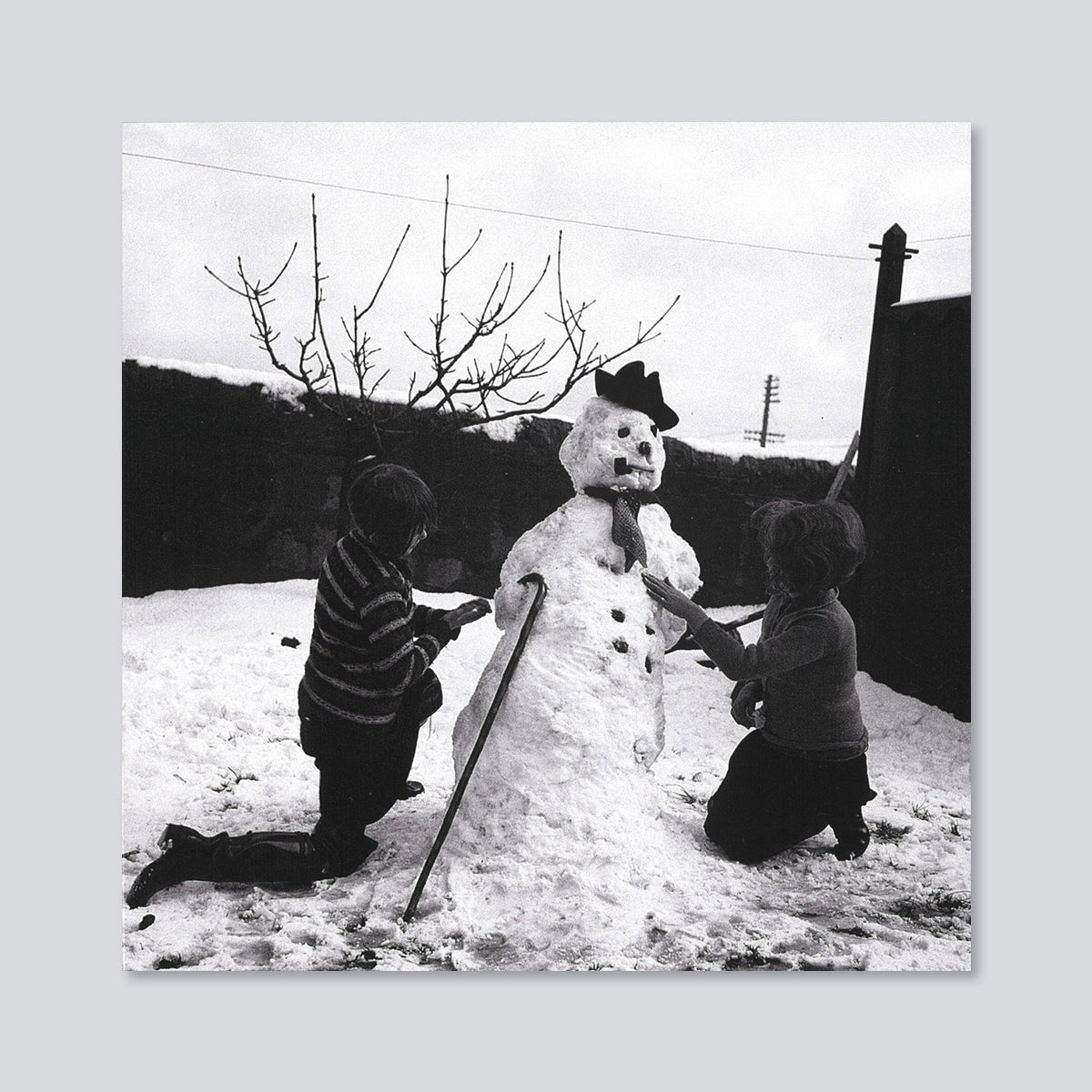 This nostalgic Christmas card features a photo held in the Photo Archive of two children building a snowman with a pipe and walking stick, 1935. Photography by J. Peterson. Photo Archive number: P02540