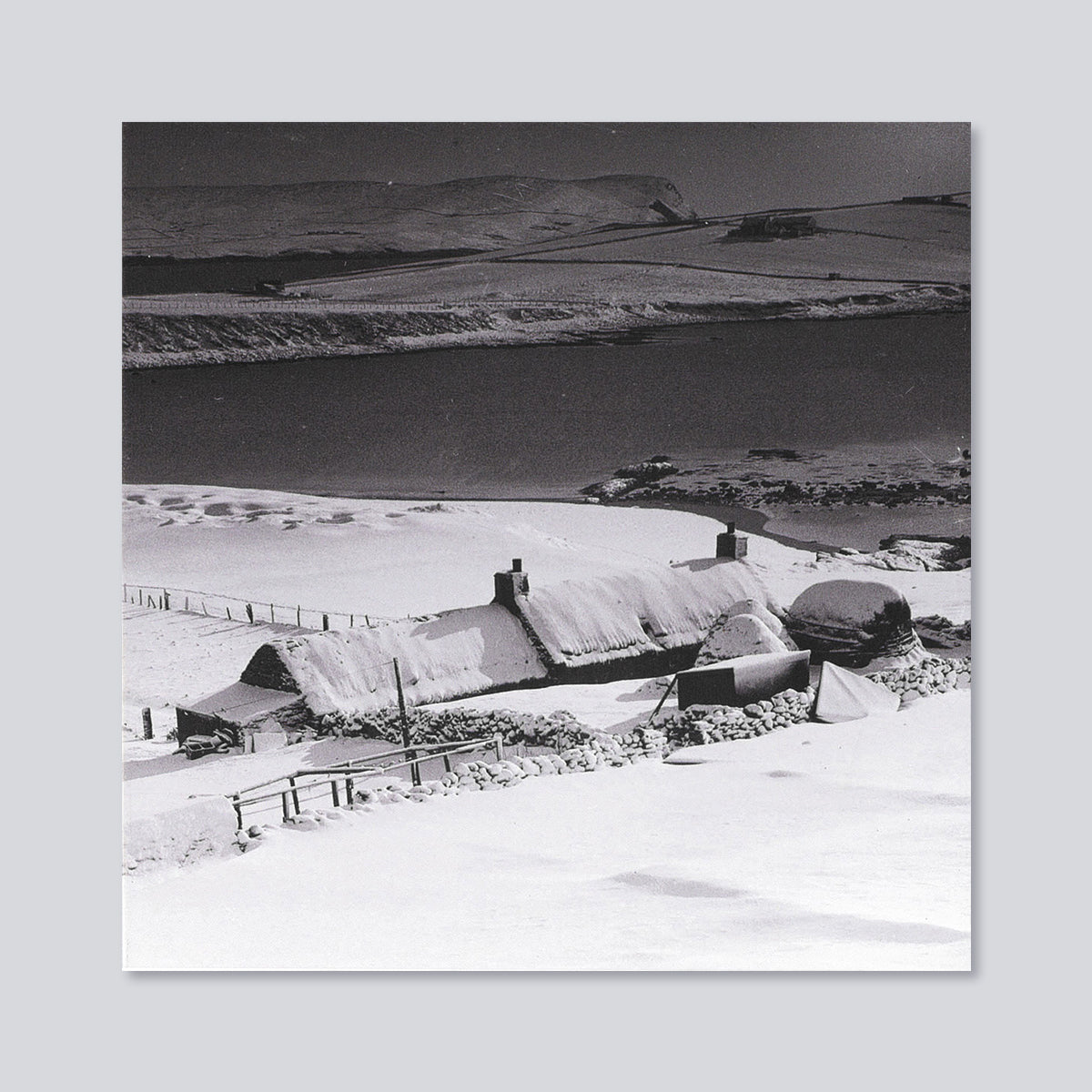 This nostalgic Christmas card features a photo held in the Photo Archive of a crofthouse with a taekit (thatched) roof at Sands of Sound, Lerwick, in the snow (before 1970s). Photography by J. Peterson. Photo Archive number: P00975