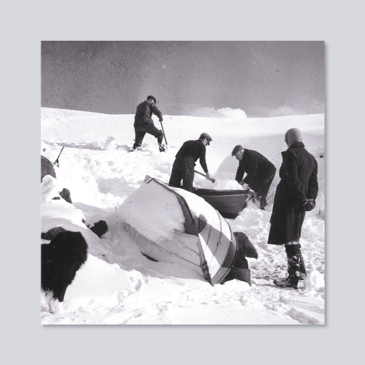 This nostalgic Christmas card features a photo held in the Photo Archive of men digging snow out of fourareens in their noost at Stivlar, Nortavoe, to make a trip to the shop at Mid Yell, 1947. Photography by J. Peterson. Photo Archive number: 00502P
