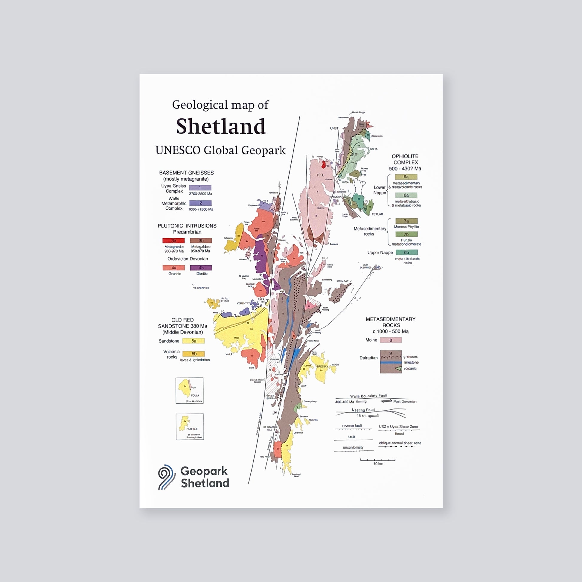 A5 postcard featuring a Geological Map of Shetland UNESCO Global Geopark.
