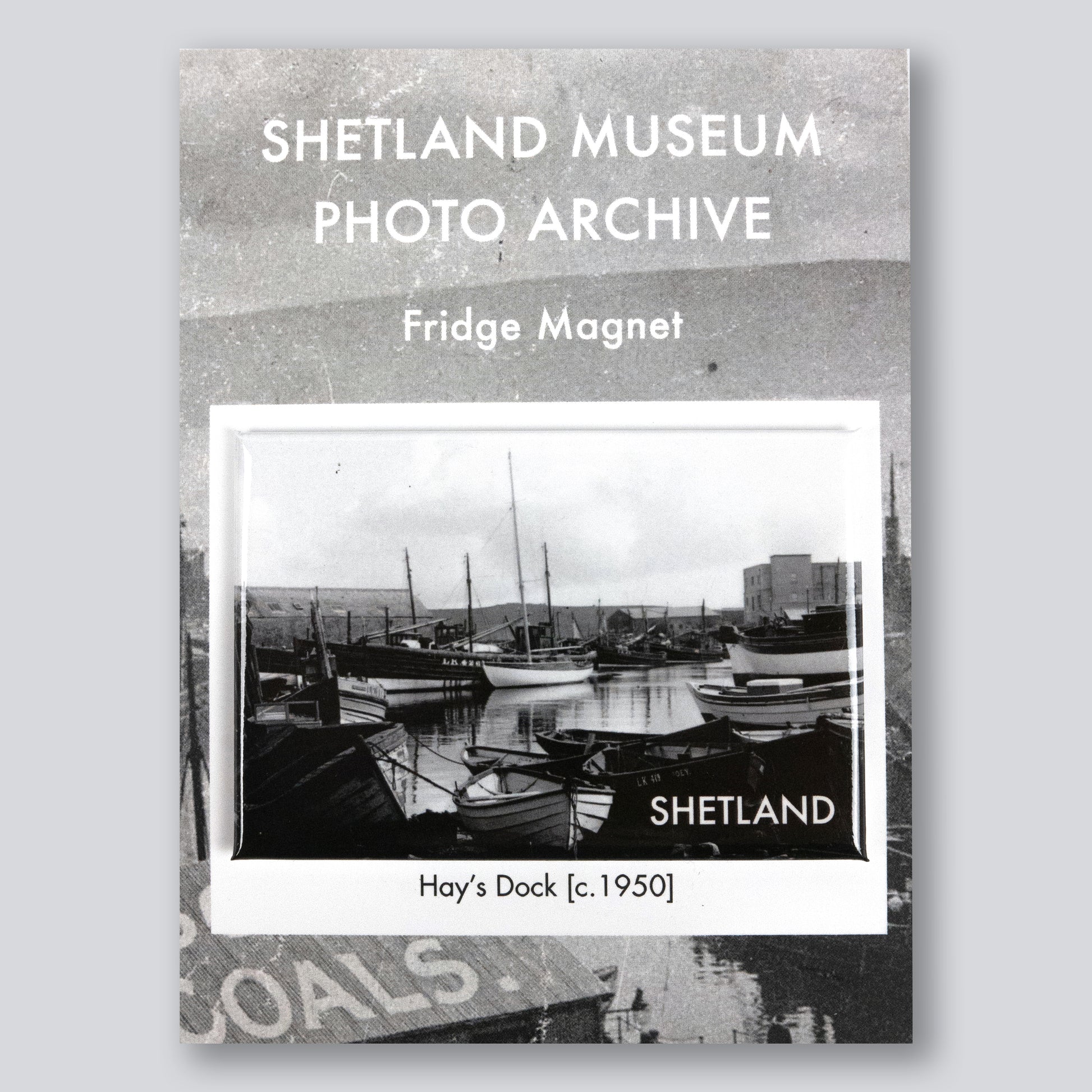 The Shetland Museum Photo Archive contains over 60,000 images depicting Shetland life, heritage and culture dating back to the 1800s. This magnet features one such photo of Hay's Dock, c. 1950.