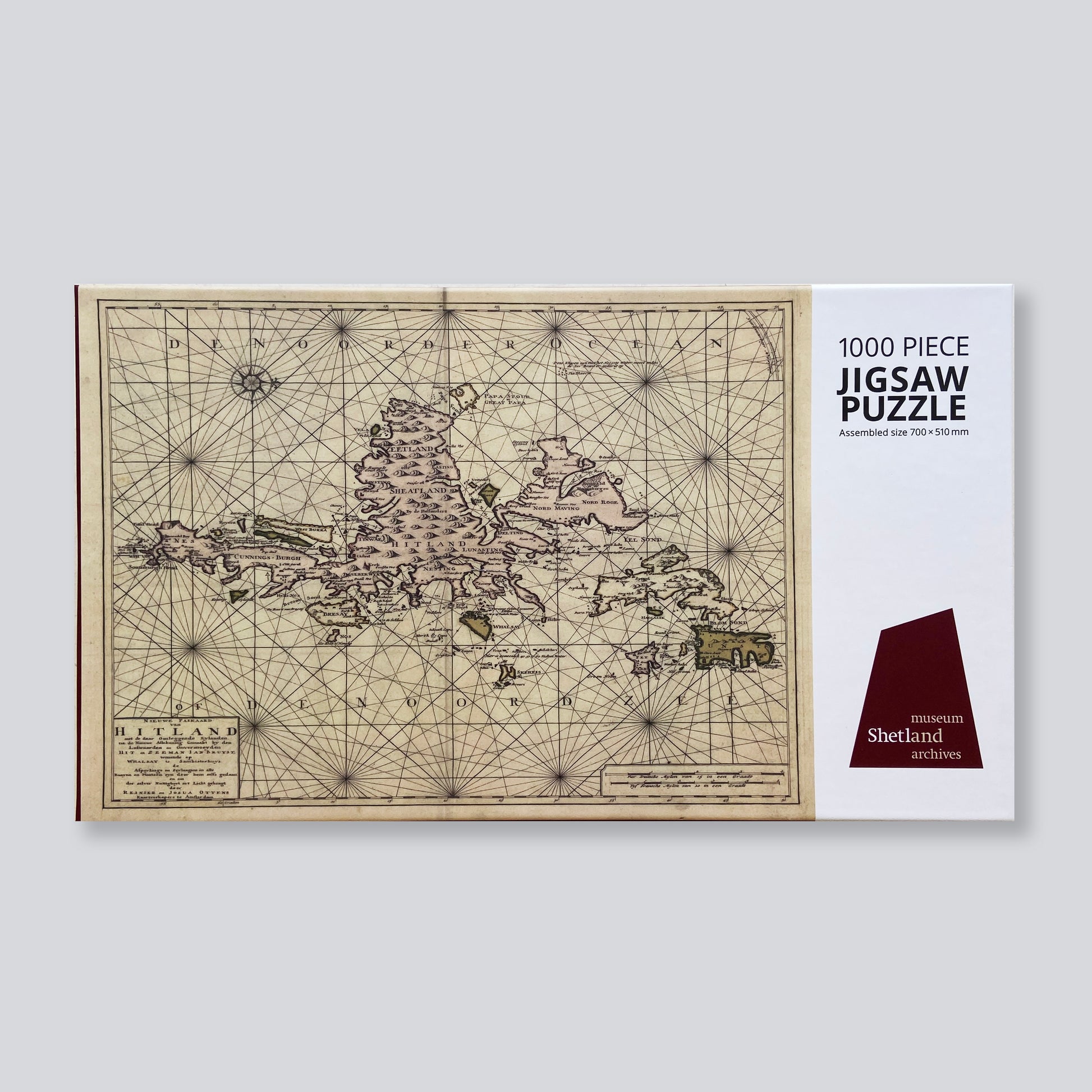 1000 piece jigsaw puzzle featuring Reinier and Josua Ottens’ map of Shetland ‘NIEUWE PASKAARD van HITLAND’, 1745.