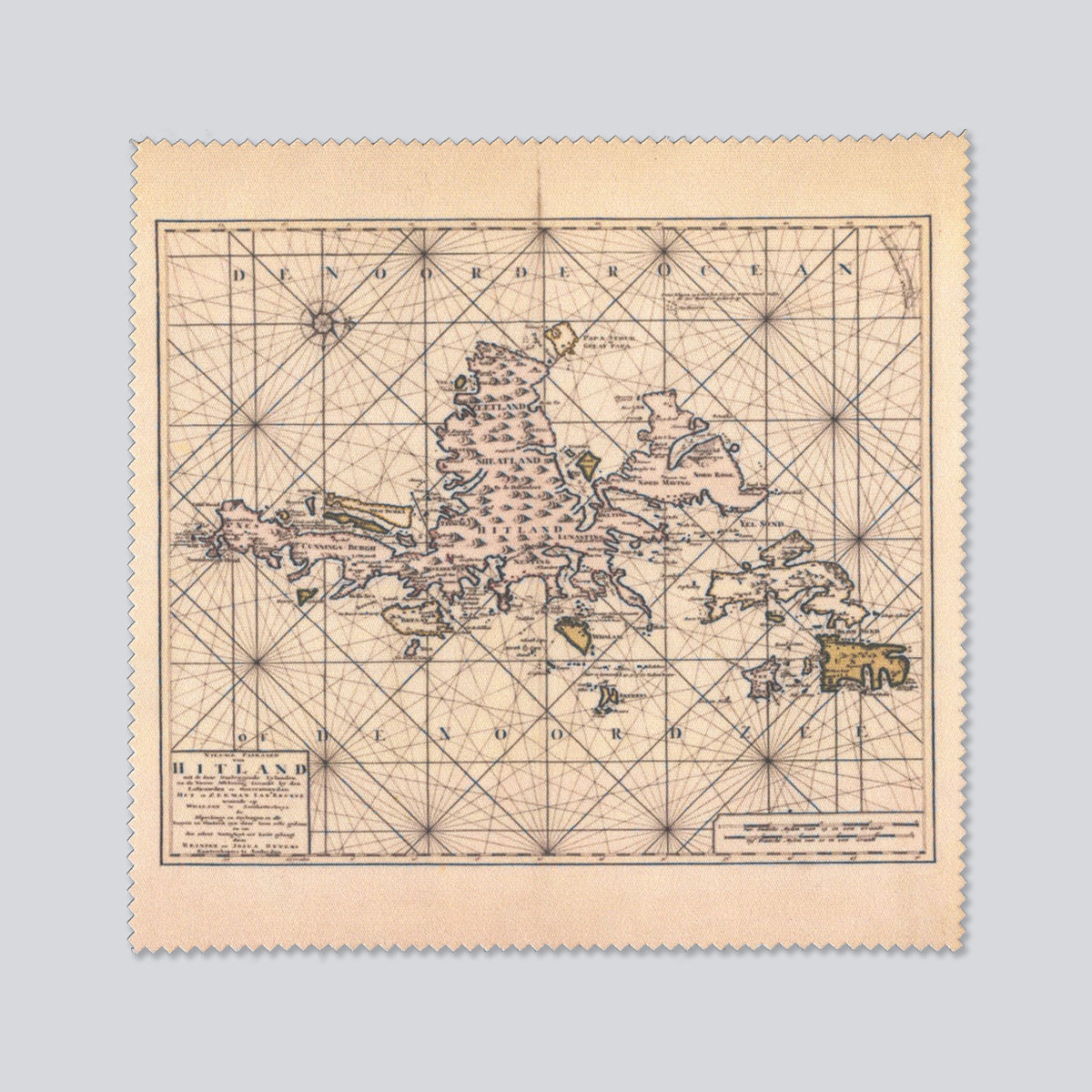 Lens cloth featuring a map from the Shetland Museum & Archive's collection: Reinier and Josua Ottens' map of Shetland NIEUWE PASKAARD van HITLAND, 1745. Original by John Bruce, Symbister, Whalsay.