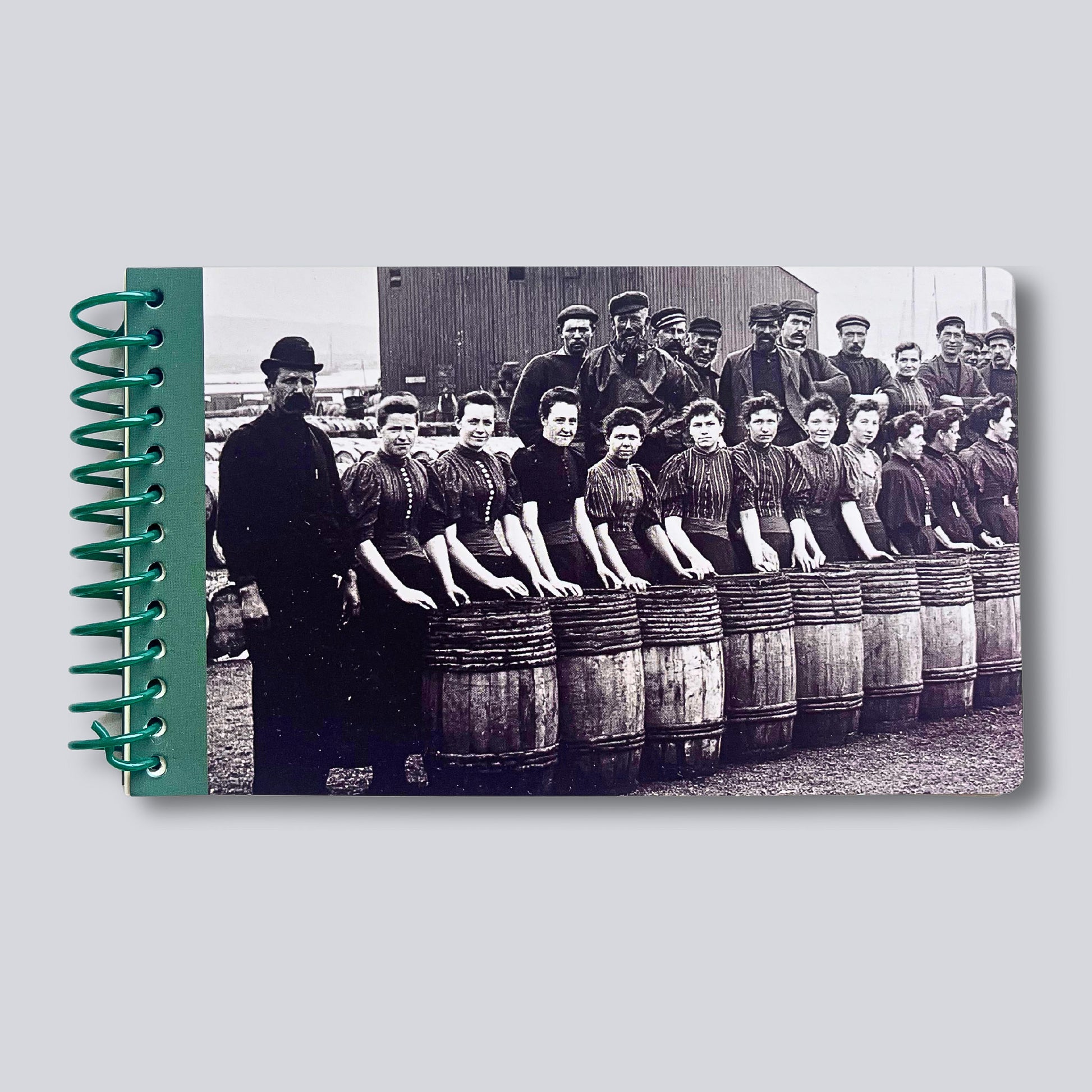 Spiral bound, landscape notebook with thick blank pages. The cover is decorated both inside and outside with images of gutters, working in the herring fishing industry, from the Shetland Museum & Archives photo database.