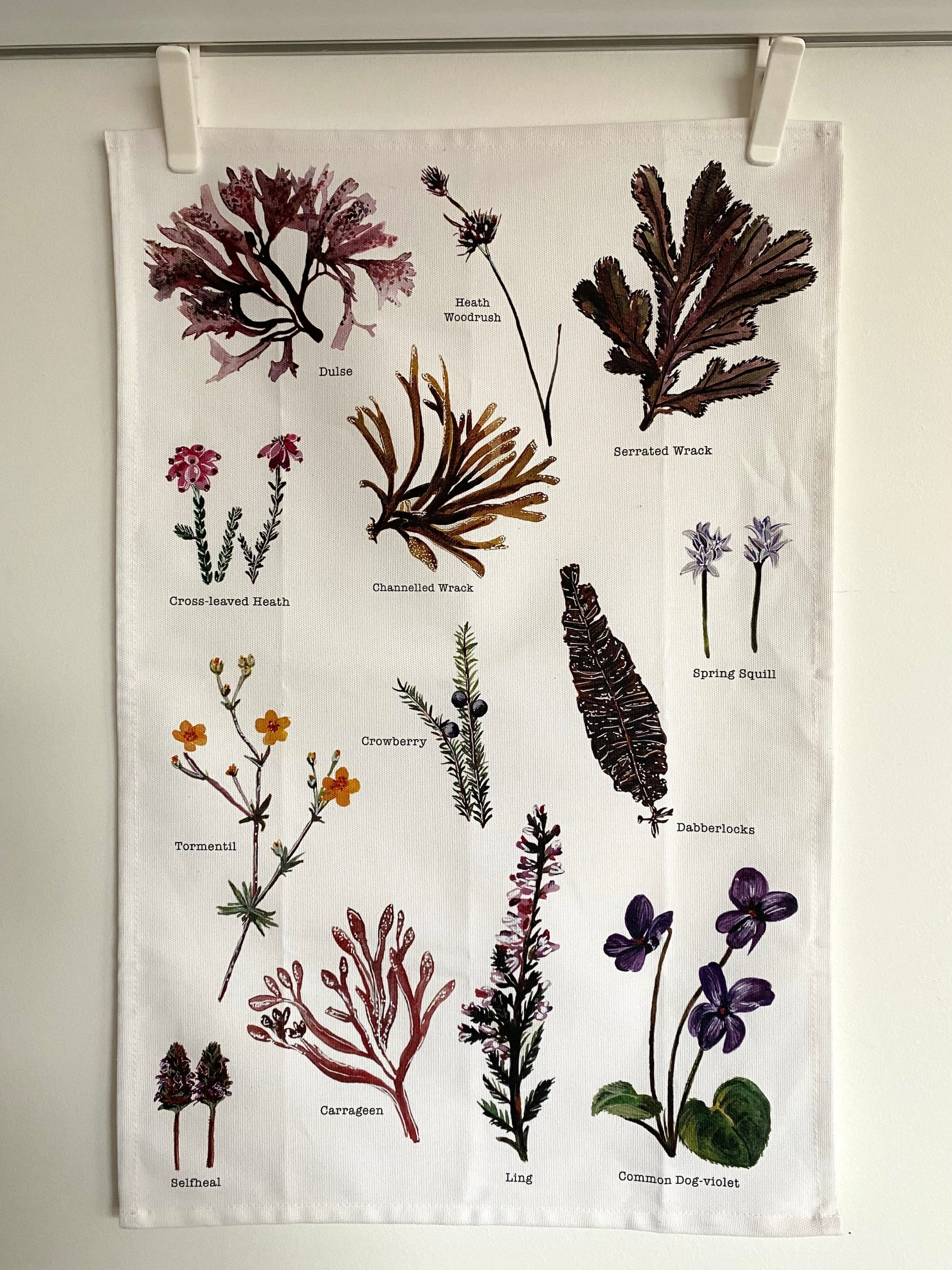 A beautiful 100% cotton tea towel featuring 13 illustrations of wild flowers and seaweeds found in Shetland, and their names.