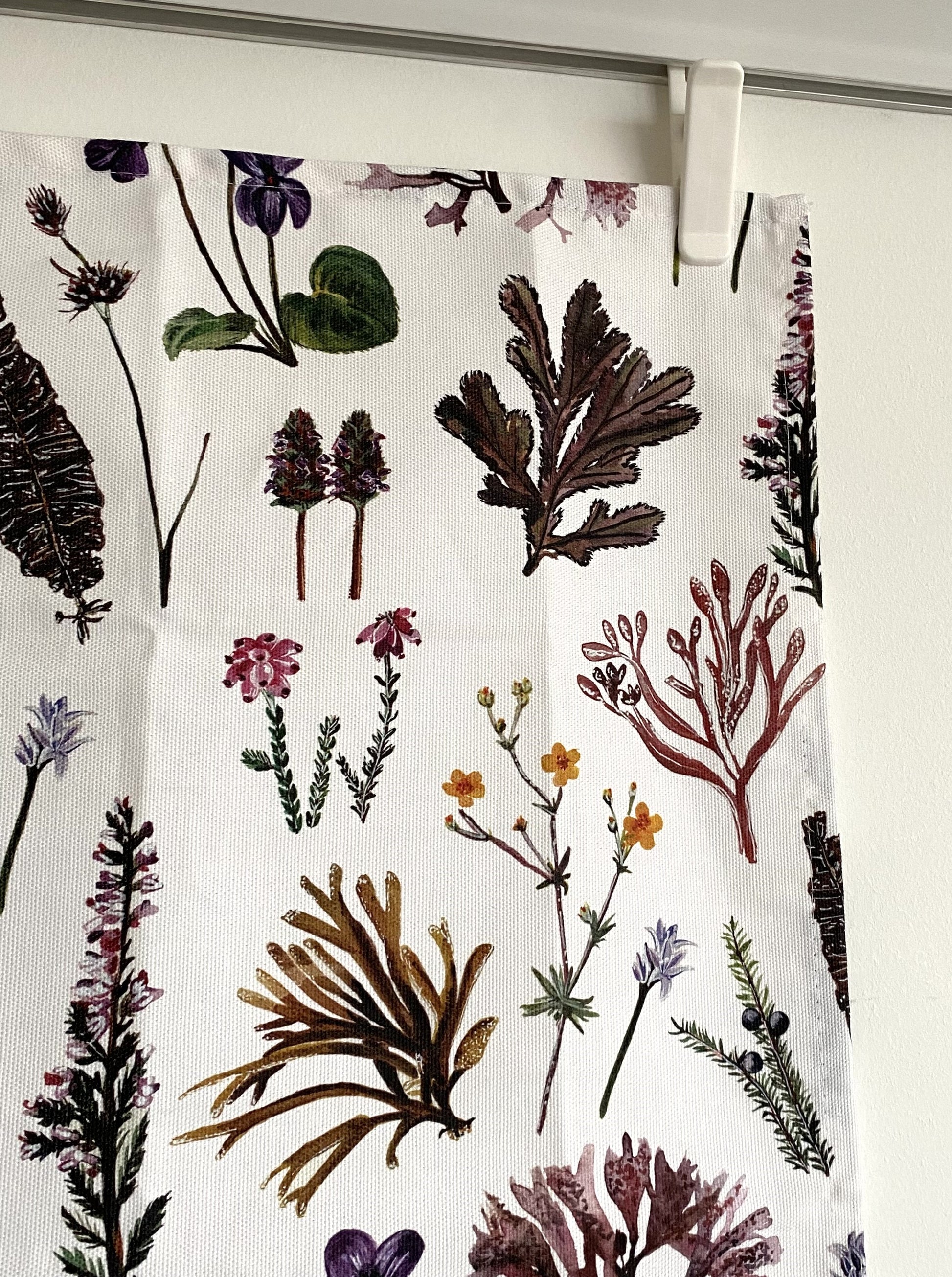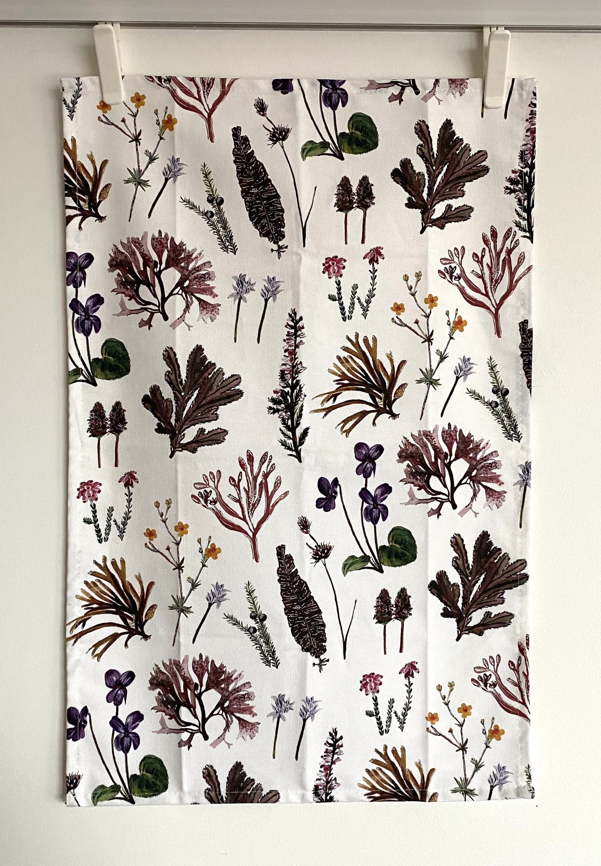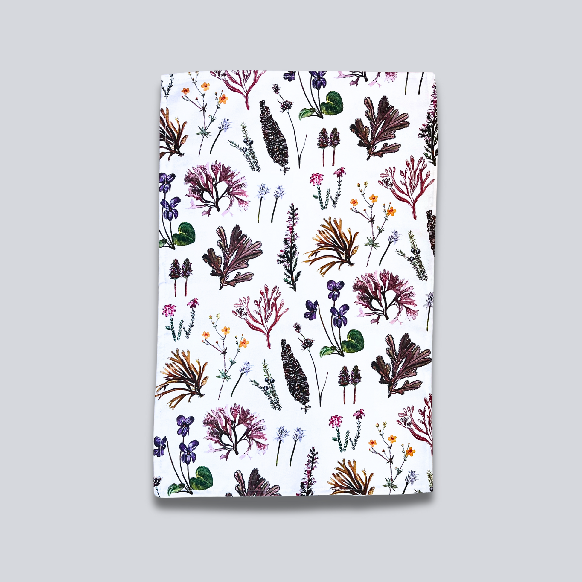 A beautiful 100% cotton tea towel featuring a pattern of 13 illustrations of wild flowers and seaweeds found in Shetland.