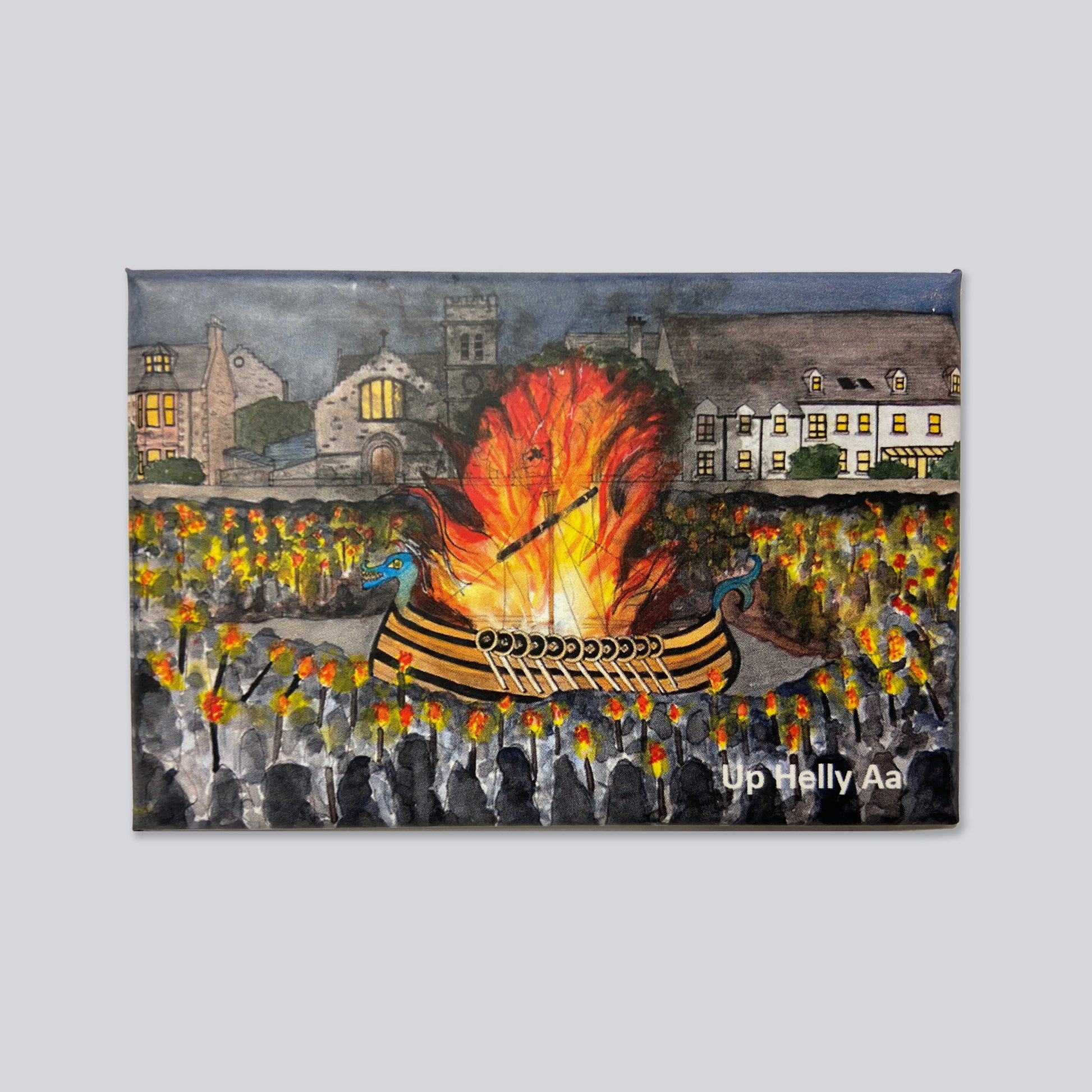 This magnet features an atmospheric watercolour illustration by KimberleyART, depicting the burning Viking galley in Lerwick, surrounded by guisers with flaming torches.