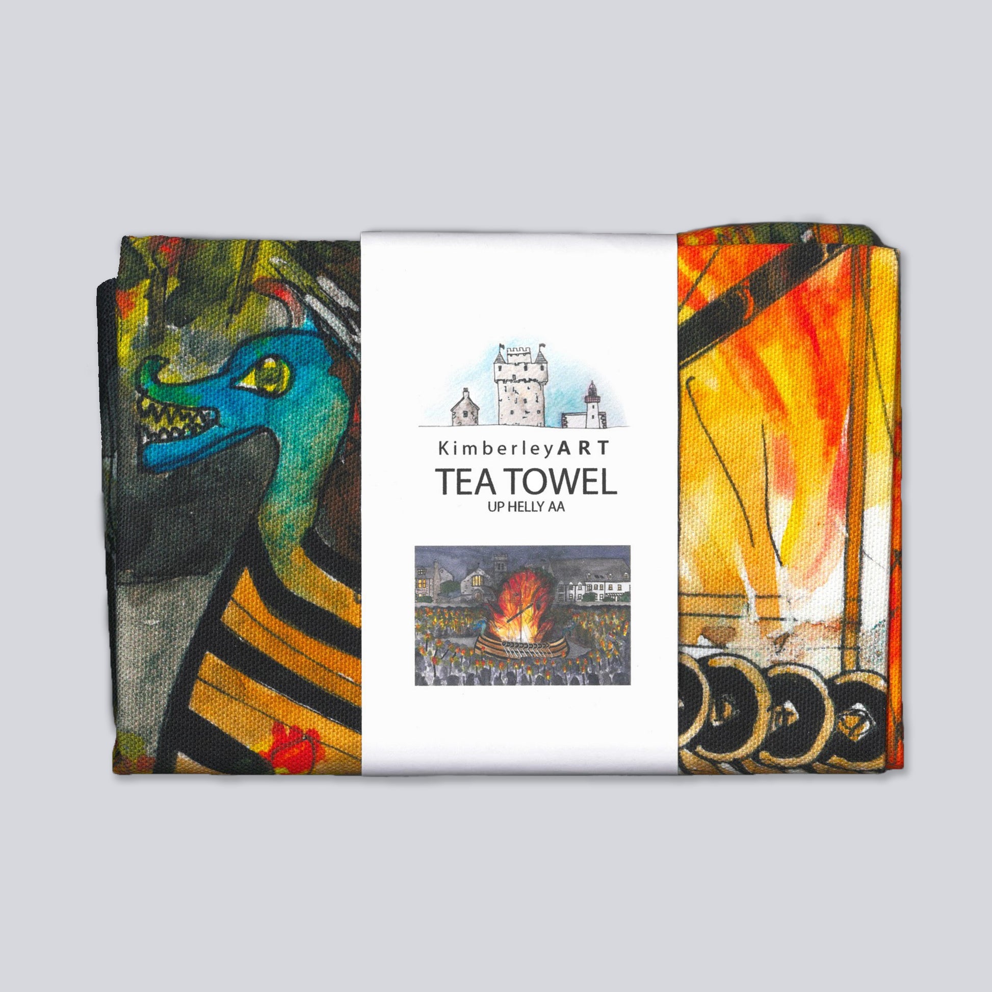 This tea towel features an atmospheric watercolour illustration by KimberleyART, depicting the burning Viking galley in Lerwick, surrounded by guisers with flaming torches.