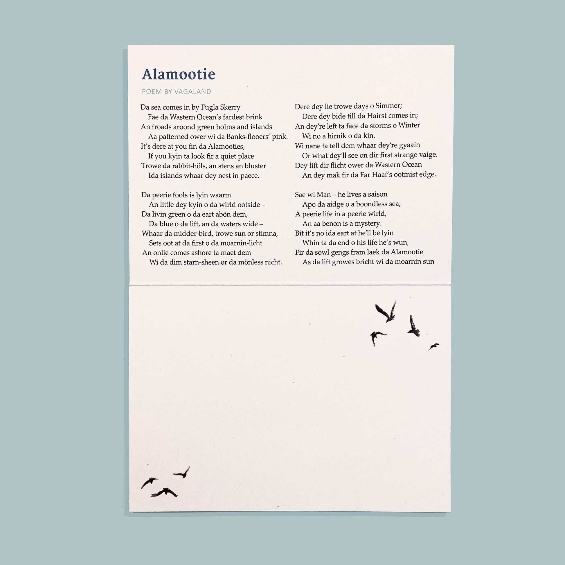 These beautiful greetings cards feature two of Vagaland's poems, 'Love in Human Herts' and 'Alamootie', with artwork by talented Shetland-based artist Aimee Labourne.