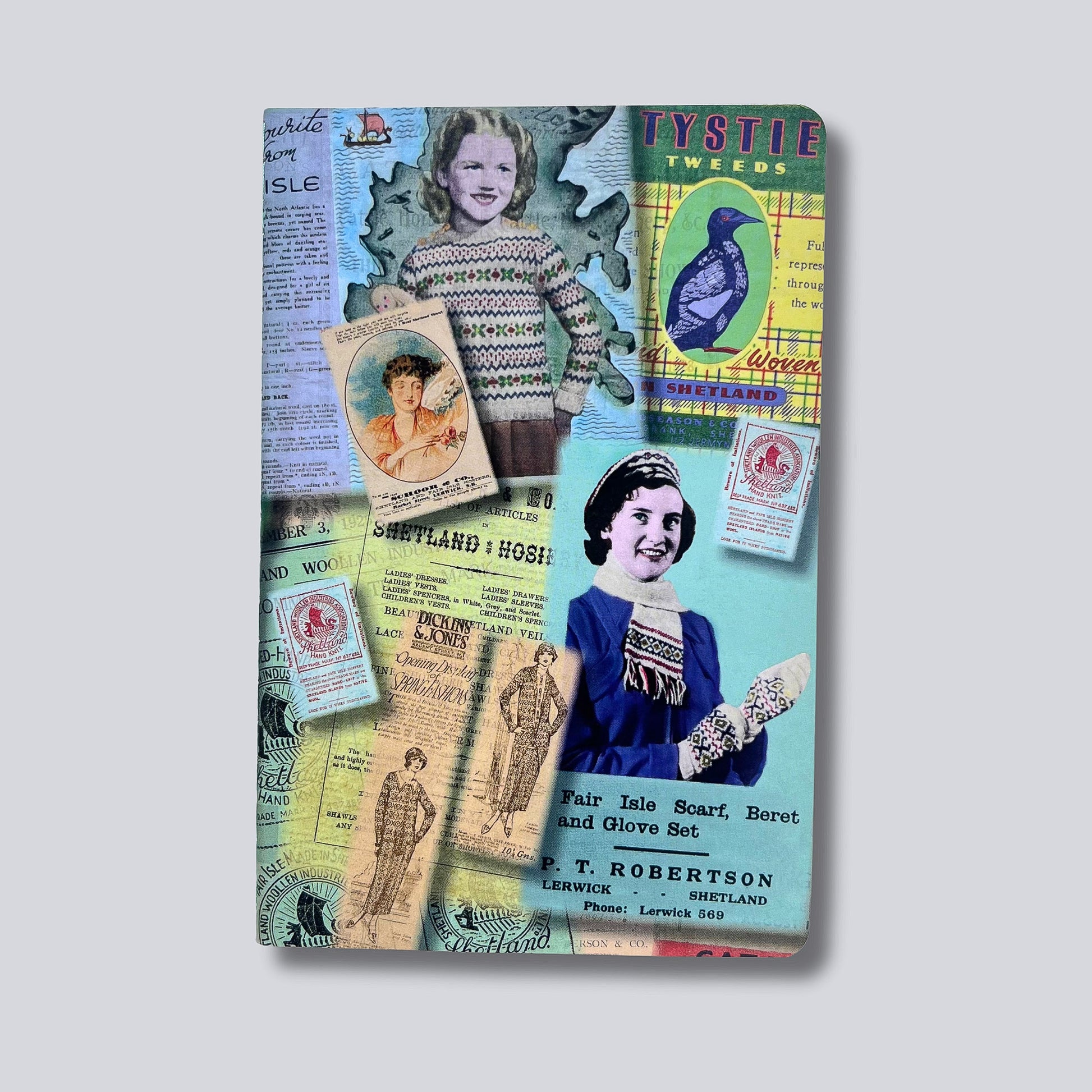 A6 size portrait notebook with stitched binding, available with lined or blank pages. The cover is decorated both inside and out with vintage adverts and textile themed images from the Shetland Museum & Archives collections and photo database.